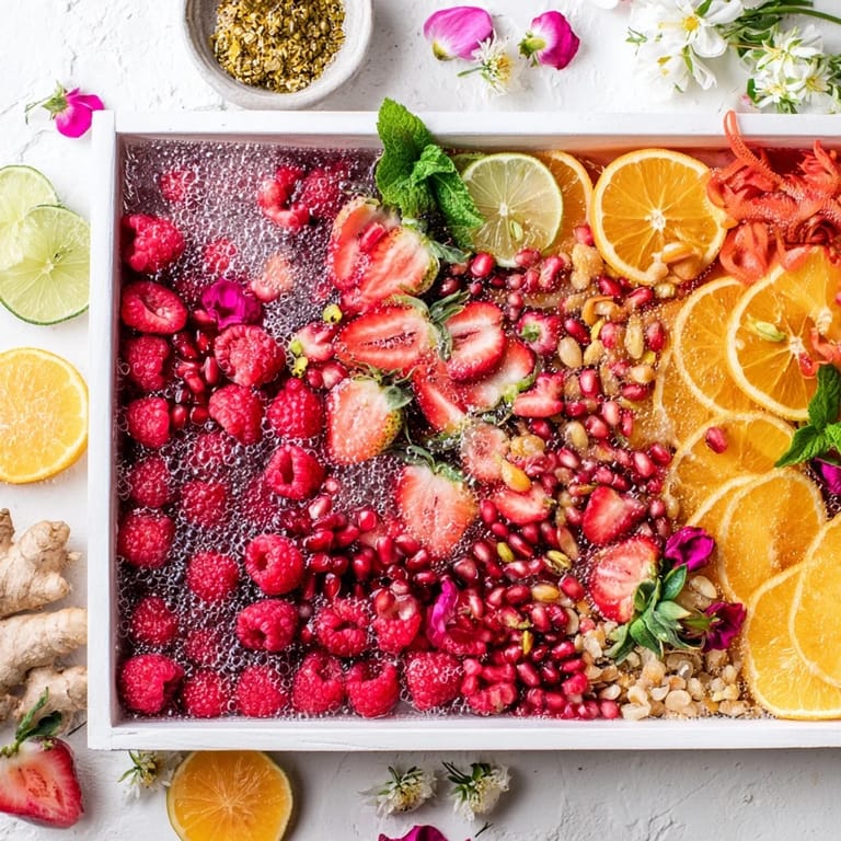 - Fresh Fruits: 1 cup raspberries, 1 cup sliced strawberries, 1 cup blackberries, 1 cup pomegranate arils, 2 limes thinly sliced into wheels, 2 lemons thinly sliced into wheels, 1 orange thinly sliced into half-wheels, 1 cup seedless green grapes halved