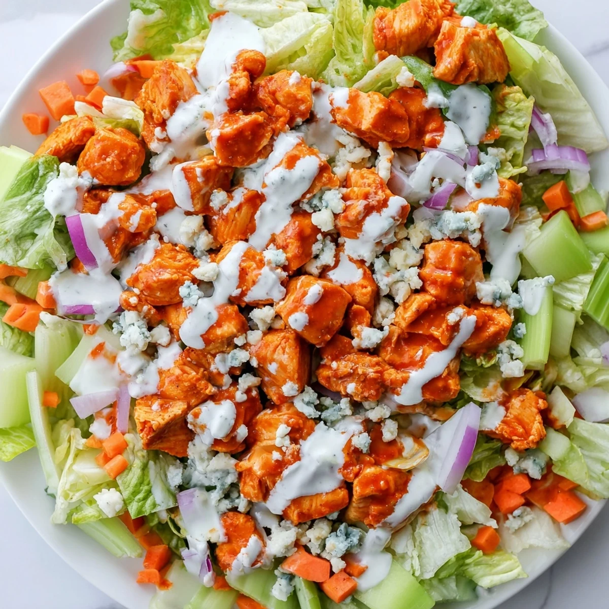 Traditional ranch or blue cheese dressing complement the spicy buffalo flavors perfectly. For extra heat, drizzle additional hot sauce over the salad. You can also use a lighter vinaigrette if you prefer less richness.