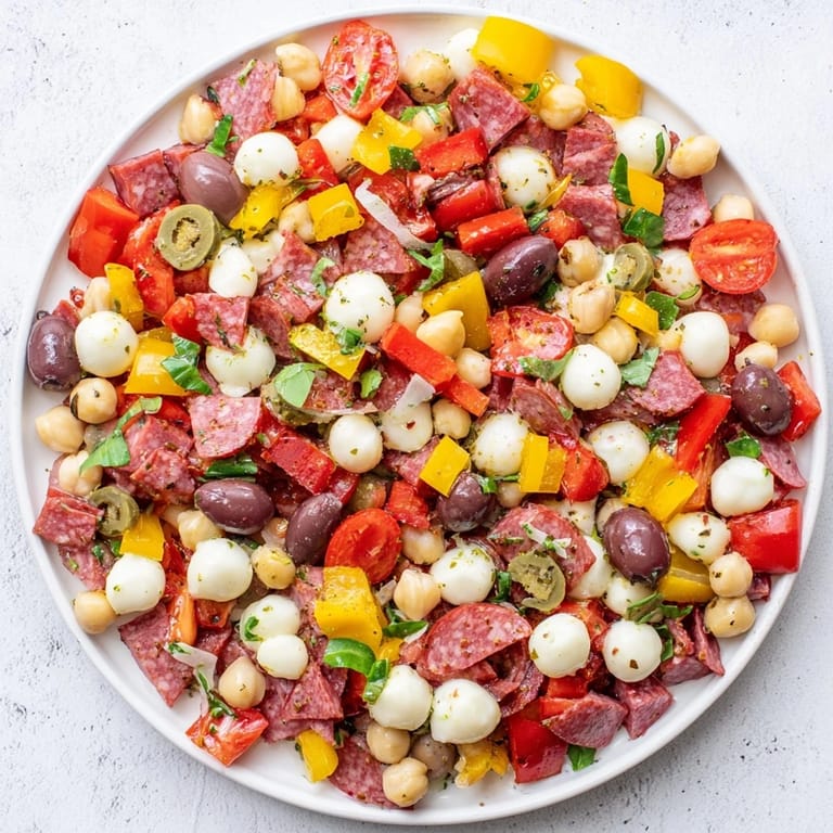 My sister in law actually requests this for every family gathering now. The first time she tried it she stood by the bowl picking out all the mozzarella pearls and salami cubes like a scavenger hunt. I had to laugh because honestly I do the exact same thing when nobody is watching.