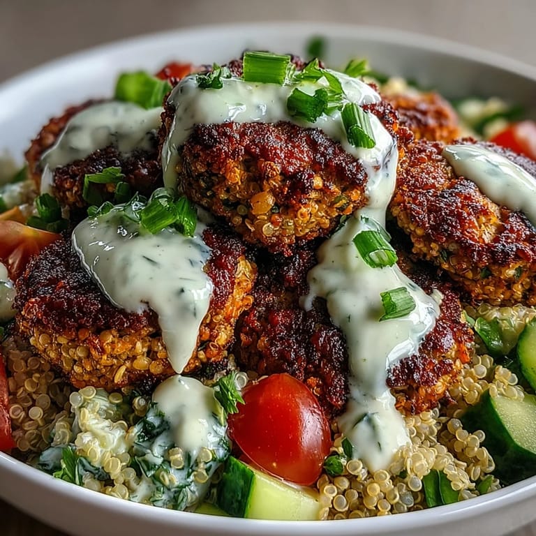 Pin It A vibrant, wholesome bowl featuring crisp baked falafel atop fluffy quinoa, paired with fresh cucumber, cherry tomatoes, and green onion. This Middle Eastern-inspired dish is both nourishing and satisfying, perfect for a balanced lunch or dinner.