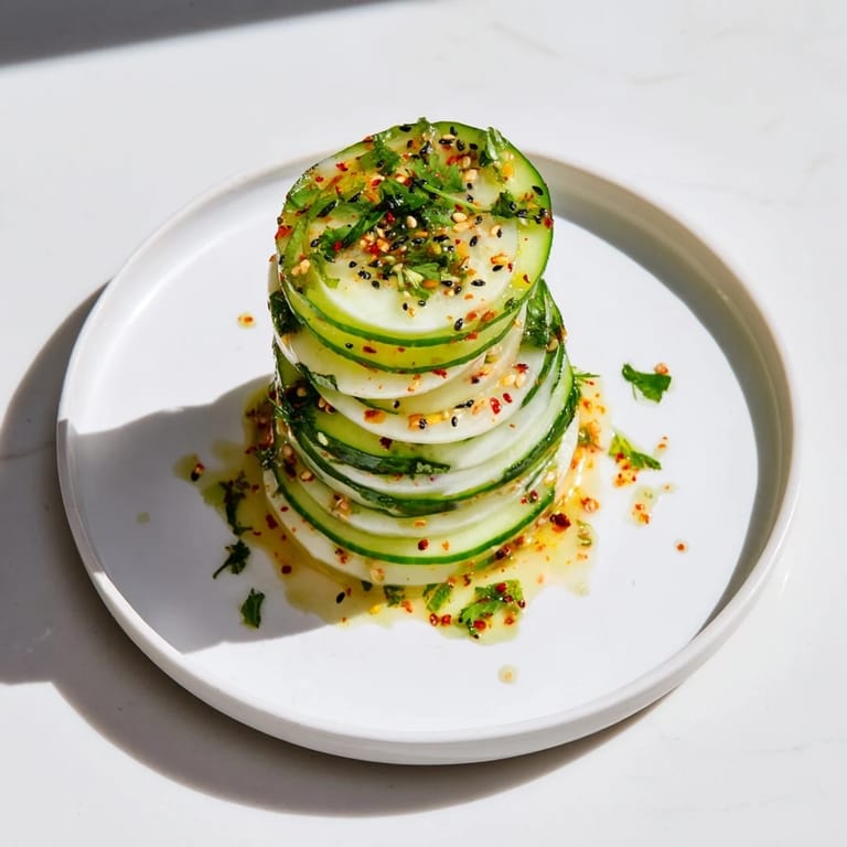 Pin It A refreshing, crunchy appetizer or side featuring crisp jicama and cucumber slices stacked with a zesty lime-chili dressing.