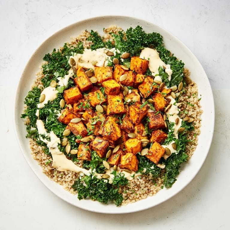 Pin It A vibrant, nourishing bowl featuring fluffy quinoa, caramelized roasted sweet potatoes, and crisp kale, finished with a zesty lemon-tahini dressing—a perfect light lunch or side inspired by coastal freshness.
