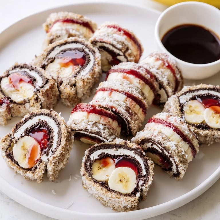 The banana is the spine, but everything else is flexible. Strawberry jam is my default because it's bright and familiar, but raspberry or apricot works beautifully. The coconut can be replaced with crushed pretzels for a salty-sweet angle, or omitted entirely if you want to taste only chocolate and cookie. I've done a peanut butter version for adults, spreading a thin layer under the jam, and it tasted like a Reese's imagined as upscale sushi. The dip is equally forgiving—melt in some espresso powder and you've got a mocha version, or add a pinch of salt to cut the sweetness. The architecture stays the same; only the details shift.