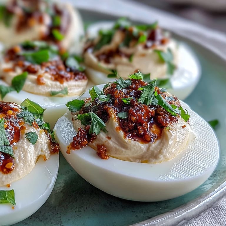 Last summer I made these for a backyard barbecue and watched them disappear in minutes. My brother-in-law, who claims to hate deviled eggs, went back for thirds. Something about that spicy garlic oil just makes them completely addictive.