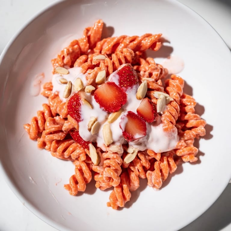 - Short pasta (fusilli or penne): The curly or tube shapes trap the strawberry juice and yogurt beautifully, giving you flavor in every bite instead of just smooth strands sliding through.